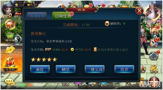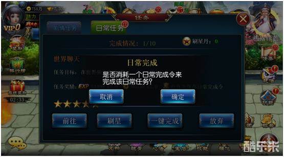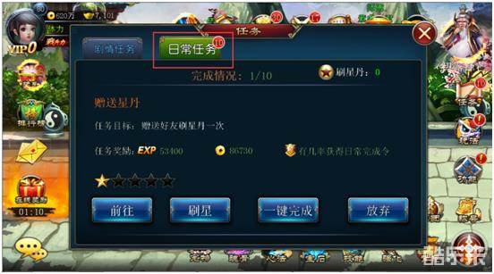 在日常任务中,可以选择放弃该任务,放弃之后则自动跳到下一个任务。也可以选择消耗一个日常完成令或花费20元宝,直接完成该任务。小编建议,一些简单的,比如世界说话、使用元宝、寻宝一次、赠送好友星丹这些比较容易完成且不用消耗体力的任务,还是尽量自己完成,那些比较难完成的任务,或者体力用完但仍需战斗完成任务的情况下,果断使用一键完成吧!