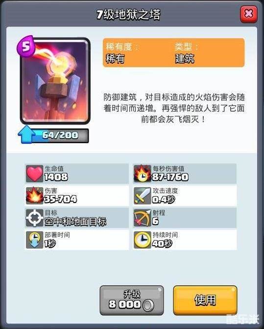 卡牌分析:地狱之塔是一张5费的稀有卡牌,这张卡牌的射程是6,并且卡牌的伤害是递增模式,虽然初始伤害较低,但是会持续增高,所以在对抗一些血量较高的卡时有着极大的优势,唯一的缺点是比较害怕小电,小电可以打断他的递增伤害。