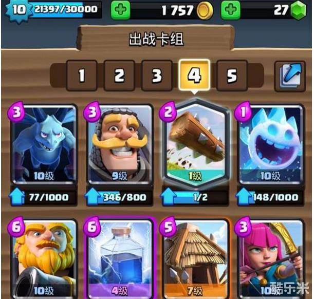 滚木,可以替换小闪,但是因为房子和其他防御兵种的原因,不容易解后置防御的公主,而且坦克加桶如果小电等级不够解不了哥布林,也是很伤的,不吃等级 但是如果带滚木有地狱塔,家驹一定后置一点攒费用大闪。