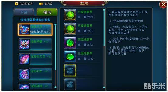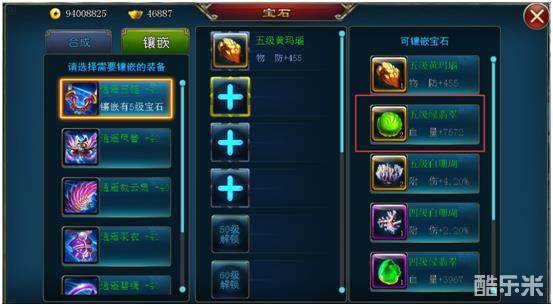 可以看到,每件装备上都有一些“+”,这些“+”表示该件装备有可镶嵌宝石的宝石孔位。点击“+”,在右边可以看到目前玩家已有的可供镶嵌的宝石。选取想要镶嵌的宝石,即可成功镶嵌。