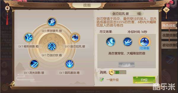 剑刃如风·破,穿透敌阵,造成基础攻击555%伤害,6秒内大幅度降低敌人防御与格挡,冷却时间16秒,该技能带有强力的控制效果,更加适用于PVP战斗。