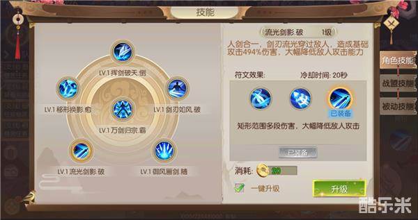 流光剑影·破,造成基础攻击494%伤害,同时大幅度降低敌人的攻击能力,冷却时间20秒,该技能附带DEBUFF效果,适用于各种玩法。
