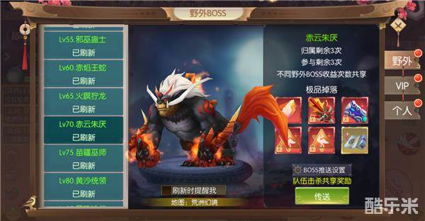 赤云朱厌,70级野外BOSS,刷新地点为荒州幻境,大侠们可以通过传送功能,到达该地图,并自动寻路至目标坐标点,开始挑战。