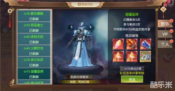 苗疆巫师,75级野外BOSS,刷新地点为荒洲幻境,与赤云朱厌处于同一地图,可自动寻路前往挑战。