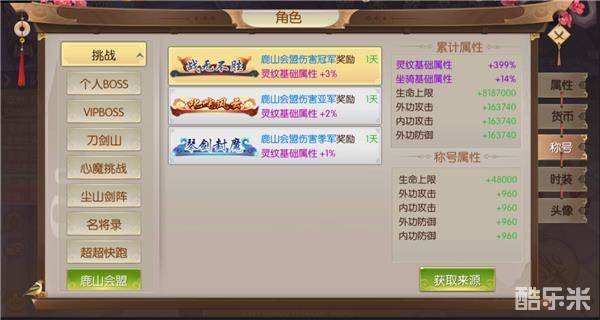 这一类称号除了能够增加攻防生命等基础属性(而且更多),还能够增加特殊属性,以挑战类称号中的鹿山会盟伤害排名称号为例: