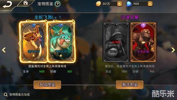 宠物可以通过宠物碎片合成,多余的宠物碎片则可以用于宠物升星,升星能大幅度提高宠物的属性。每个宠物都能护佑一位英雄,从而增加相关英雄的属性。而收集越多的宠物就能激活宠物图鉴,同样的,激活属性就能提高团队的整体属性。