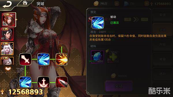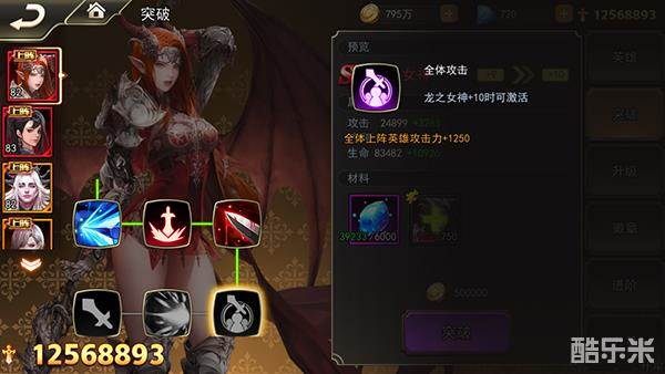 就拿我们的橙色英雄来说,突破1级会解锁英雄的特殊技能,突破7级则会解锁光环增益,突破11解锁则会大幅度强化英雄技能,之后的每次强化都会超大幅度的提升英雄or团体的属性,但是所付出的消耗品数量也是非常巨大的。