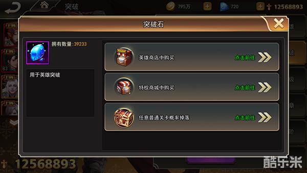 英雄突破:英雄突破是英雄提升战斗力的一个重要途径,通过英雄突破可以使英雄获得更多的能力,而紫色英雄突破满级10,紫色以上英雄突破满级为12级。英雄突破需要消耗突破石、金币和大量英雄碎片,而随着消耗物品的越来越多,突破所带来的属性加成也是呈阶梯状上升。