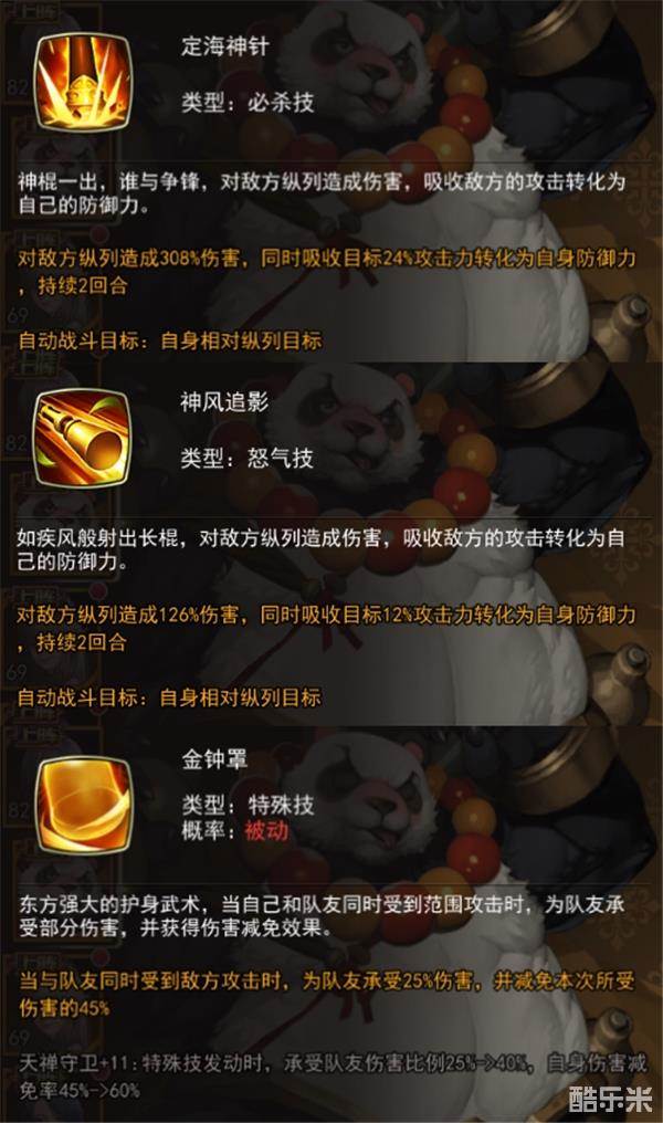 神棍一出,谁与争锋,对敌方纵列造成伤害,吸收地方的攻击转化为自己的防御力。对敌方纵列造成308%伤害,同时吸收目标24%的攻击力转化为自身防御力,持续2回合。