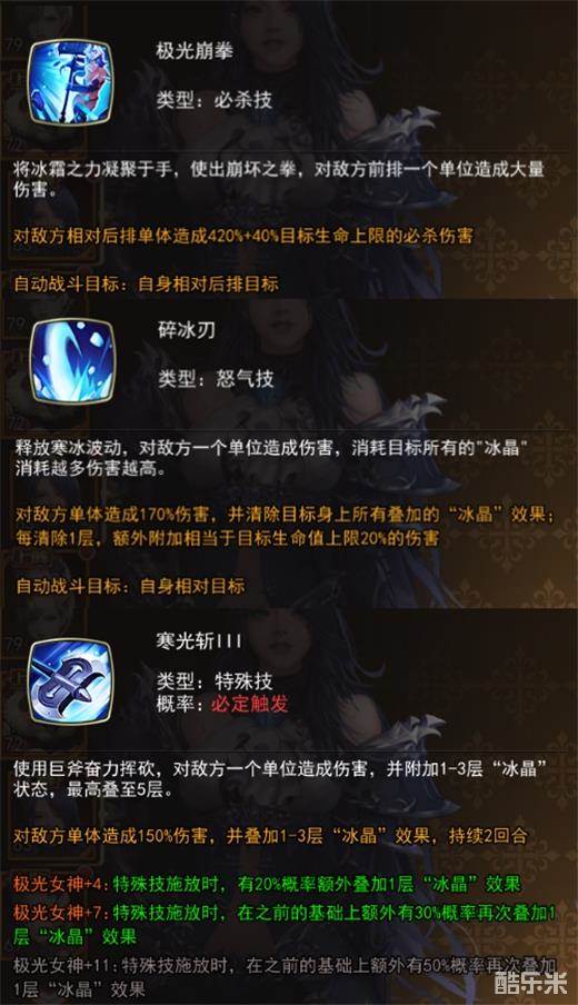 特殊技能 是被动对敌方单体造成150%伤害,也就是说必定是1.5倍的攻击平砍效果, 而且会叠加一层*冰晶*持续2回合,并且在+4+7+11的时候有用更高的概率去在次叠加冰晶。