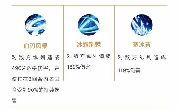 雪之誓言必杀技能对敌方纵列造成490%必杀伤害,并且在2回合会持续每回合造成90%的伤害,怒气技也是纵列造成189%的伤害,并且在+7后附带流血重伤效果,该效果会导致治疗效果减半。特殊技还是纵列造成119%的伤害。并且在+4后也会附加流血效果,所有技能都是针对纵列。