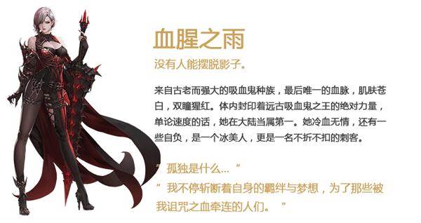 出身不明、是暗杀组织“幕”的一员。以佣兵的身份游历大陆、活跃在各个雇佣兵军团中,她所接手的护卫任务从未失败。因其出手迅捷狠戾,被广大佣兵和雇主称为“血腥之雨”。