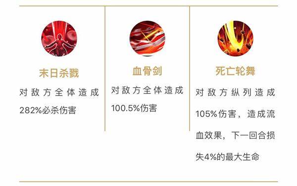 当今群攻英雄热门,前中后期都有不俗表现。必杀技对敌方全体造成%282必杀伤害,60级以前伤害非常客观。怒气技对敌方全体造成%100.5伤害+ 4%112.5 + 7%126 + 11%156(+9突破前二回合加%18伤害,+9以后提升非常高),特殊技触发一般对纵列造成%105伤害,下一回合损失%4最大生命值。