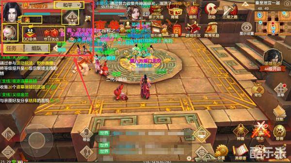 然后是珍兽的头像,可以查看到当前出战珍兽的状态。人物血条上方则是服务器时间,然后是对战模式选项,点击对战模式,可以选择更换个人攻击模式和查看到对战信息。变强图标中,点击可以查看到游戏变强指导。最后则是当前任务栏和组队状态。