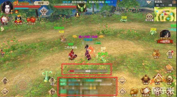 游戏中下界面,主要是行动栏和聊天栏。行动栏就是日常采集行动,任务采集行动,捕捉珍兽等等。聊天栏,就是和其他玩家聊天的地方。