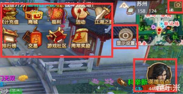 右上界面主要是游戏中一些活动玩法的选项。累计充值,商城,福利,活动,排行榜,交易,游戏社区,周常奖励,江湖之路等。都可以在右上区域查看到,然后就是小地图功能,可以查看到当前所在地图的名称和坐标。