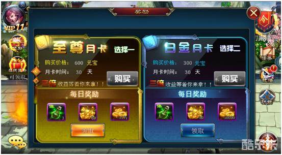 先是月卡。可以看到,月卡共分为至尊月卡和白金月卡2种。至尊月卡花费600元宝,白金月卡花费300元宝即可购买,时效30天,每天都可领取高额奖励,累计3倍的元宝收益返利哦!还能每天免费领取体力瓶和金币,是不是很超值呢!
