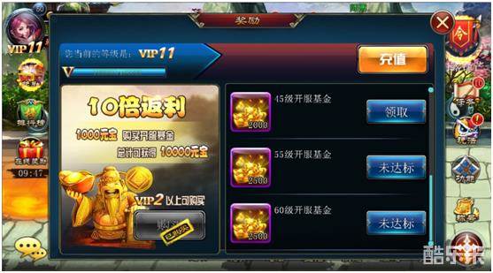 隆重介绍最后一个长得像绩优股一样的福利--开服基金。看到左边手托元宝的财神爷了吗~VIP2及以上的玩家可以花1000元宝购买此基金,此后达到一定等级即可领取不同数量的元宝,总计可获得10000元宝!!!你没看错,10倍的返利,算不算财神爷驾到呢!