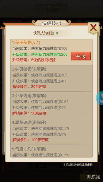 侠侣技能的解锁需要侠侣亲密度,侠侣技能的升级则需要侠侣技能经验。