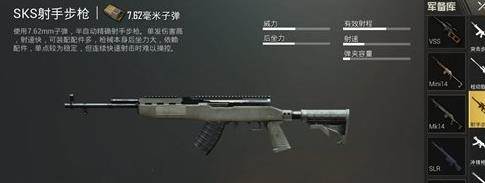 SKS射手步枪想必大家都不陌生,点射威力强劲的它,搭配满配件后,高倍镜远距离追踪非常稳,扩容后能装20发子弹,完全够你击倒数名敌人,算你五发子弹击倒一名敌人,灭队绰绰有余了,而且相比于拉栓狙来说,节约了许多装弹时间。