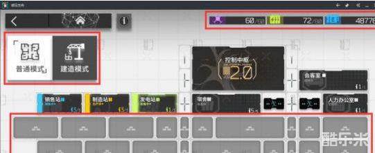 建造模式:清理房间,升级房间等。进度受控制中心影响,控制中心升级关键道具需要通关特定关卡获得