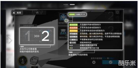 4.技能升级可以提升干员技能的强度。技能等级为1-7级,不论多少技能都通用这个等级。之后可针对个别技能提升“专精”,实质上为单个技能的8-10级。