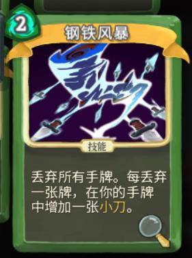 钢铁风暴 稀有卡 2费 丢弃全部手牌换来同等数量的小刀 升级费用不变,换来升级过的小刀。