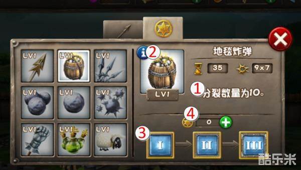 (1)选项卡按钮,从左往右依次是弩弹、魔法、士兵、科技。