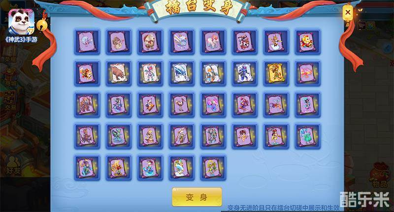 3、物品、伙伴布阵、队伍布阵界面显示变身造型,并在造型右上角额外增加“擂”字;
