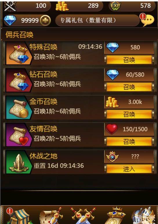 血钻召唤就是用血钻来抽,可以1次1抽也可以10连抽,10连抽会有3阶到6阶佣兵,并且每次至少有一个4阶及以上的佣兵;金币召唤则是用金币抽佣兵,1次1个,每次要的金币翻倍哦,会出现1阶到6阶佣兵;友情召唤则是好友互送的友情点数进行召唤,每天大概可以抽2次,可以抽到2阶到5阶佣兵;最后是休战之地,休战之地会随机刷出6阶、5阶、4阶佣兵,根据自己的需要可以用恩惠值兑换,6阶分为36000、24000,18000一个档次,5阶佣兵分为9000一个档次,4阶佣兵则是1000,。