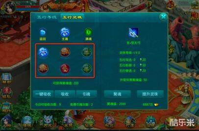 2)消耗五行聚魂值可以提升五行灵珠的等级,从而提高各项五行属性,等级越高消耗的聚魂值越多。