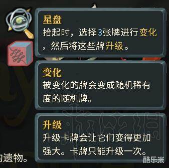 唯独这个玩意,星盘,变化是每张牌对应一个变化,诅咒对应另一个诅咒,不同的打击会变成不同的东西……但是所有牌的变化可能性是确定的【打击A】→【XXX】 【打击B】→【xxx】,可以通过SL来选择不同的牌来变化,但是如果全都试过了也没有好牌……那么就不会变出好东西了。