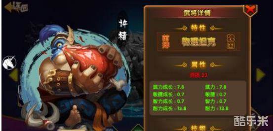 许褚是一个23资质的前排物理坦克型武将,在其技能方面,