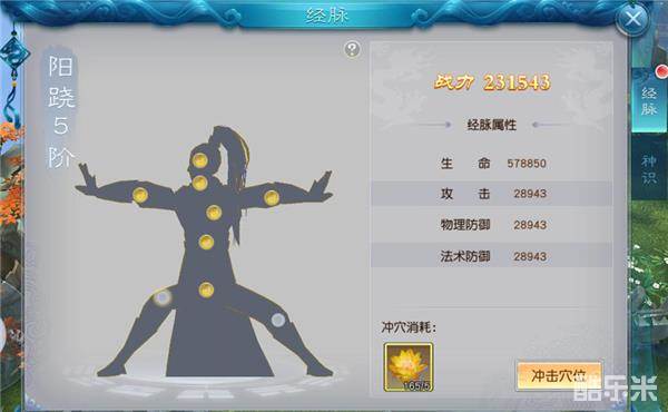 每个经脉分为9个穴位,消耗雪莲可以冲击穴位。冲击全部穴位后,可打通当前经脉,进入下一个经脉的养成。