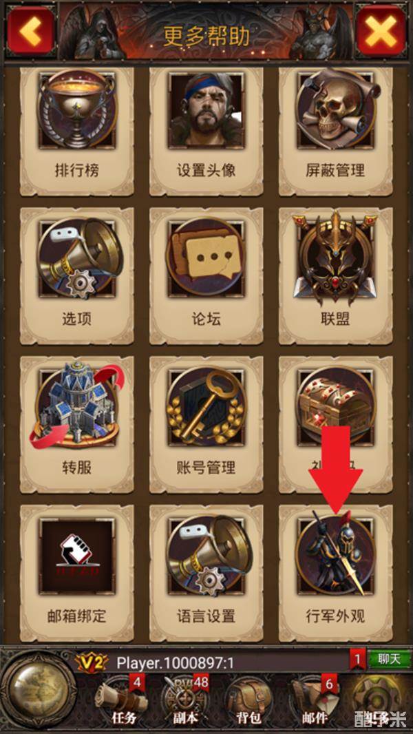 1、想要获取行军外观可以在更多菜单里面点击“更多”选项,最后一行的最后一个便是行军外观。点击行军外观,选择自己喜欢的外观,获取并使用就好了。