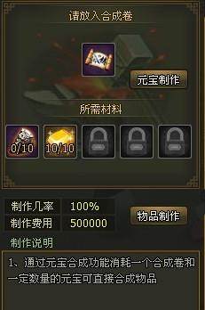 当玩家材料收集完成之后可以通过物品制作装备,此处也提供了快捷入口,通过元宝合成制作。