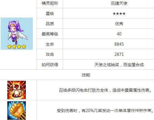 全民精灵迅捷天使属性技能还是相当不错的,这款精灵是在天使之城中推出的精灵。我们可以在天使之城中抽奖获得它,也能在百宝屋中合成这款精灵。从外形上来看,的确是天使的造型,能力方面也还不错,还是有一定的治愈功能的。