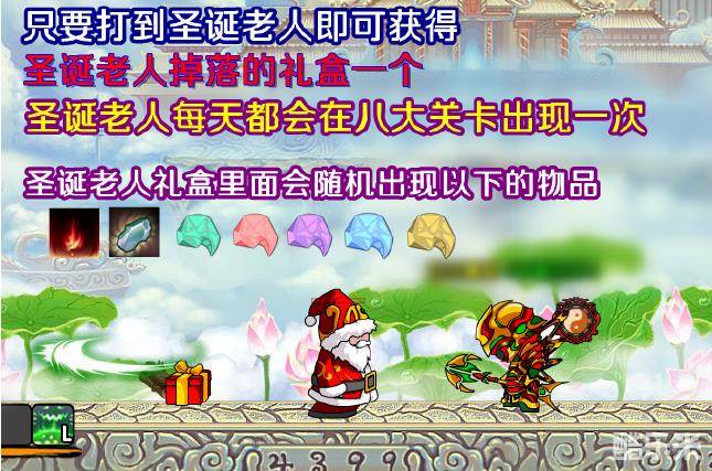 打败圣诞老人即可获得圣诞老人掉落的礼盒一个,打开礼盒有惊喜。