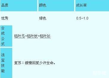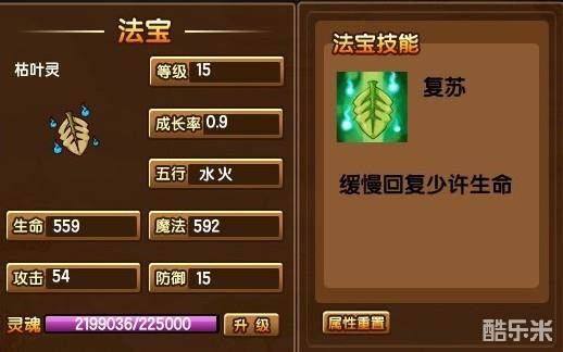法宝技能:等级越高回血就越多,最高15级哦.枯叶灵的成长率最高是1.0,少了点啊
