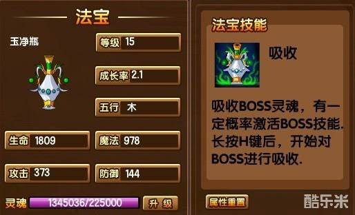 法宝技能:吸收BOOS技能,用BOOS技能来打小怪和BOOS的,这是以其人之道还治其人之身的好法宝.