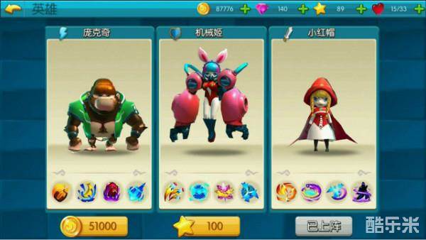 游戏目前共有4个可用英雄,每个英雄有1个专属主动技能和3个被动技能,每升1阶可以解锁一个技能;