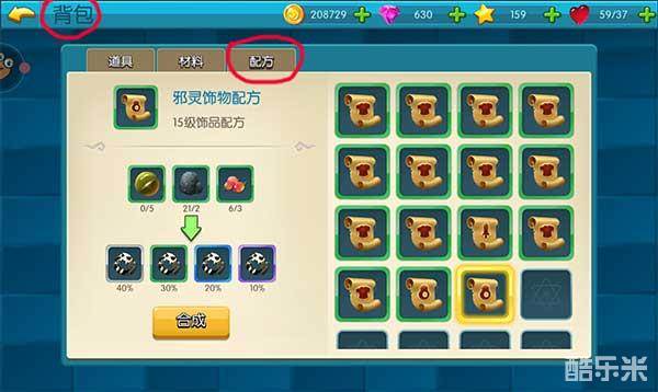 点开右下方的“背包”,选择“配方”可以查看已有的配方。