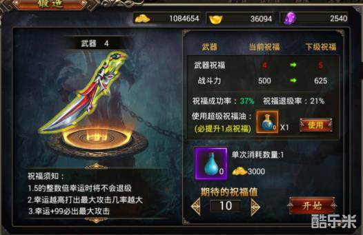 在游戏中的武器会有个祝福系统,这是一个考验人品的功能,因为我们想提升这个武器的祝福值会使用祝福油和少量金币道具来进行提升,而每一次的祝福会存在成功和失败的因素,而运气不好还可能会出现退级的情况, 当我们下一次的祝福是5的整数倍时,进行祝福是不会退级的,我们的幸运值越高,造成最大攻击的几率也就越大,当我们的幸运值达到99一定能出最大攻击。