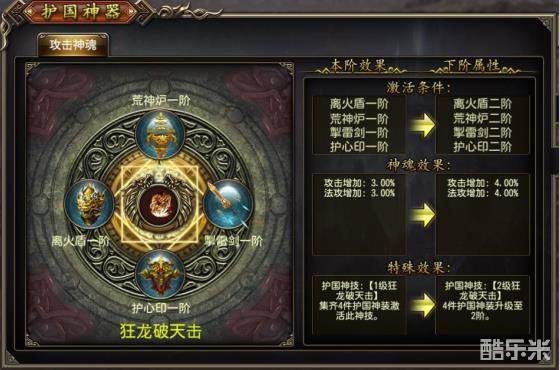 神器在凑齐4件之后便会组成为一套,此时除了会根据百分比增加属性以外会获得一个非常强力的技能,出家旅行团战PK必备之物。神器等级达到一定限制可以自动提升神技等级。