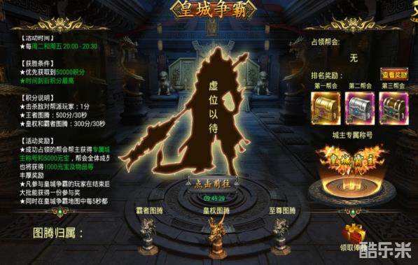 人气不减的皇城争霸,堪称团战经典!参赛公会成员可在日常活动里面的大型活动进入,玩家每击杀一名其他公会的玩家获得1积分,优先获取5万积分或者时间到了,各帮会积分最高者获得皇城所有权,资源大大的有哦~