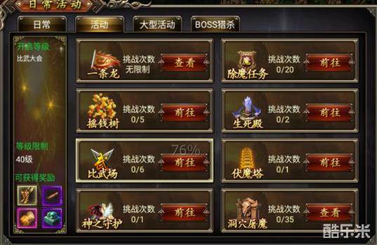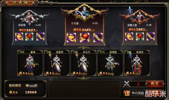 比武场需要人物达到40级才能挑战,打开比武场挑战界面时会显示5个玩家的信息,左下角会显示你的等级和战力,你可以自由选择5个其中之一的对手挑战,挑战胜利会取代对方排名,被挑战或战胜信息会显示在面板上,如果突然发现排名往后掉了,可以留意挑战记录面板,那说明有对手战胜你了。购买挑战次数需要消耗200元宝一次。