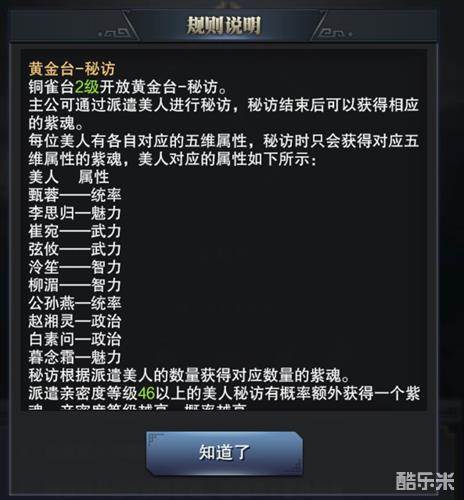 想要让紫将升橙首先需要获得每一个升级阶段都需要用到的重要道具——紫魂。当主公的铜雀台达到2级后,将会开放“秘访”功能,秘访最多可以派遣三名美人为主公寻找紫魂。每个美人可以寻到的紫魂属性都不尽相同,主公们可以根据自己的需求,派遣对应属性的美人前往秘访,若派遣的美人亲密度超过46级,还有机会额外获得一个紫魂哦!