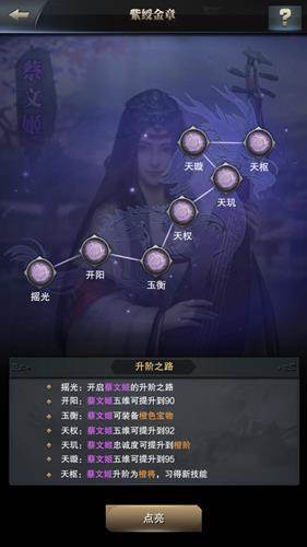 活动开启后且主公的铜雀台等级达到2级时,在“活动中心”—“精彩活动”的界面中可以找到“紫绶金章”的活动。主公可以在活动页面参加紫将蔡文姬的奖励任务,完成任务后可以获得蔡文姬升阶所需的大量道具,让主公能够快速获得橙阶的蔡文姬。紫将升阶成橙将需要历经7个阶段的蜕变,每个阶段需要用到对应属性的紫魂以及其他道具,包括对应属性的兵法、低级战策、珍宝鉴与名品。每升级一个阶段,紫将都会解锁一部分橙将的属性,如五维上限和忠诚度上限提升等。当紫将经过七个阶段完全升阶成为橙将时,将会获得一个全新技能。