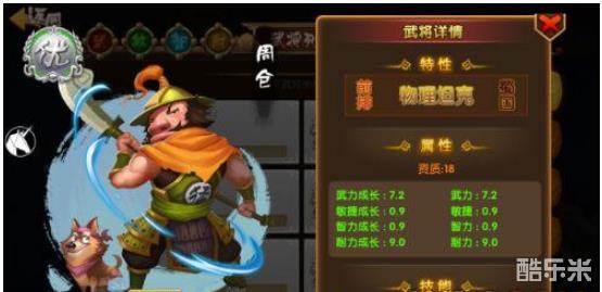 周仓是一个18资质的前排物理坦克型武将,在技能方面上,