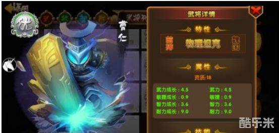 曹仁是一个18资质的前排物理坦克型武将,在技能方面上,